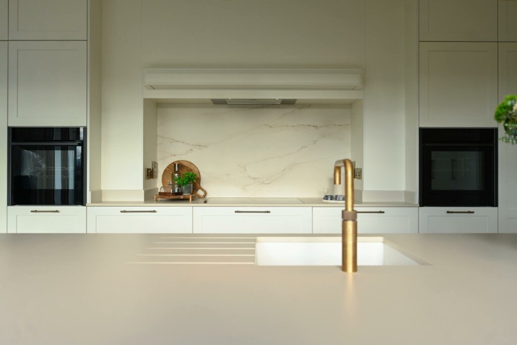 We designed a transitional shaker kitchen that balances classic and contemporary. The main cabinetry is finished in Windborne White, keeping the space light and soft, while the island in Railings adds a bit of contrast and depth. We paired this with Dekton Ares, which works beautifully for a family kitchen — durable, understated, and easy to live with.