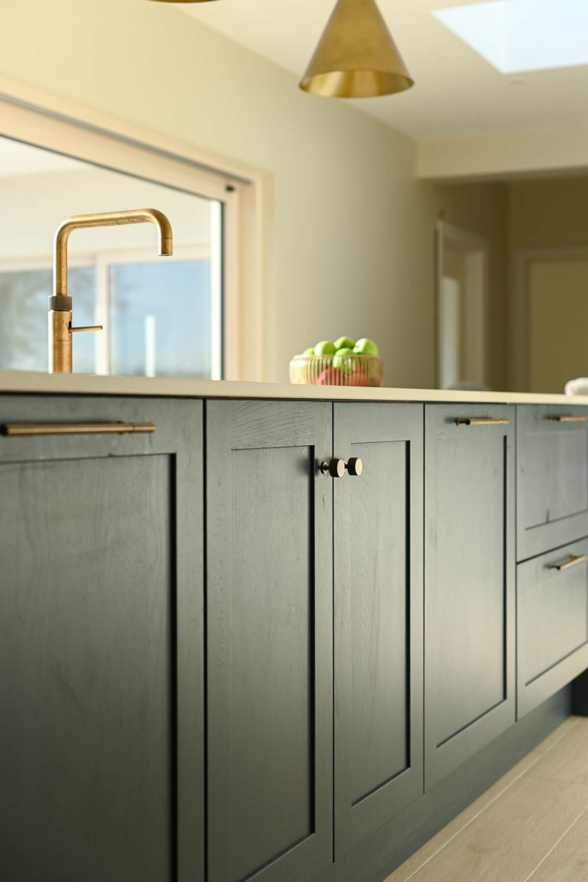 What really shaped this kitchen was how the family wanted to use it.We included a walk-in pantry to keep everyday items tucked away, and focused on making sure everything had its place. Small details like the step-out plinth and antique brass handles help give it that more bespoke, considered feel. The patinated brass Quooker tap and Neptune island lights bring in warmth and make the space feel finished without being overdone.