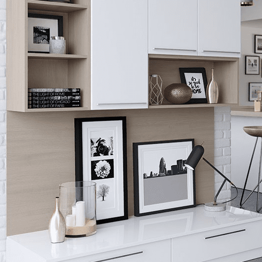In this home office, located on the mezzanine floor, the natural warm colour palete provides a calming influence. The Strada Gloss Light Grey finish on the cabinetry reflects the abundance of light from the window. Plenty of storage means it remains clutter free. All of this, will no doubt get your creative juices flowing.