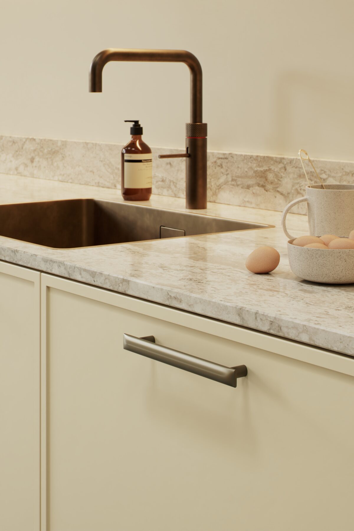 Cabinet knobs in three elegant finishes: Brushed Brass, Gun Metal, and Inox Look. Pull handles in matching finishes, available in two popular lengths: 160mm centre distance and 320mm centre distance. These sizes make them ideal for everything from smaller drawers to wide cupboard doors.