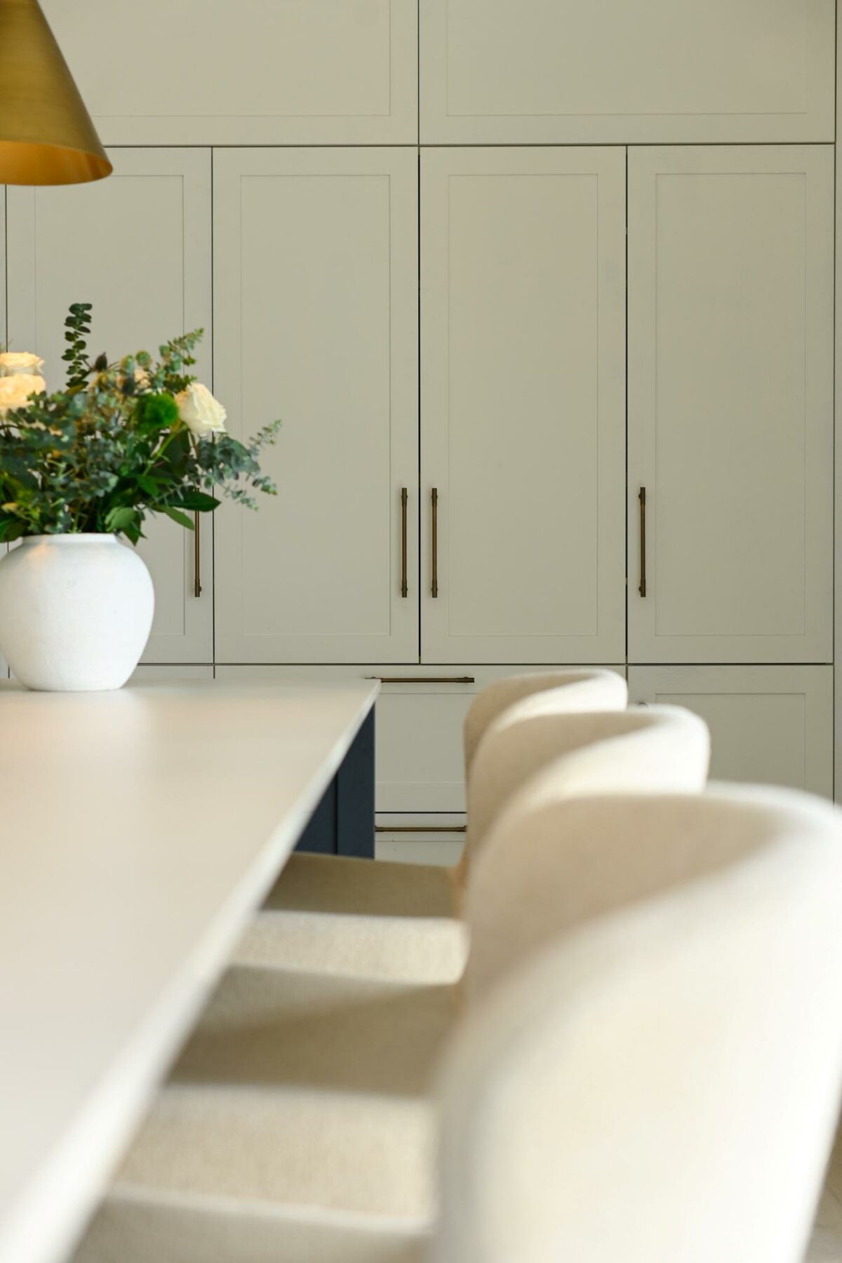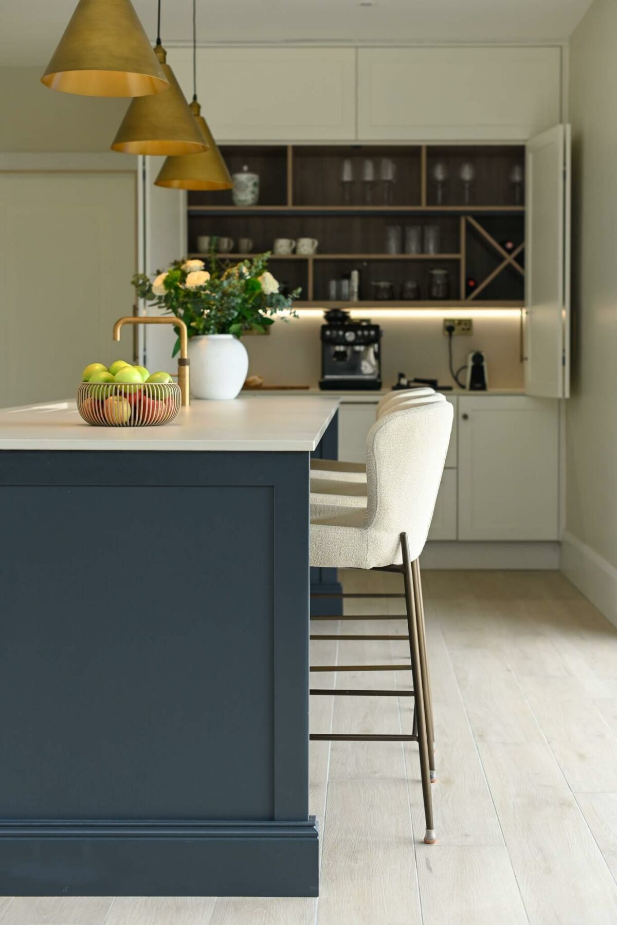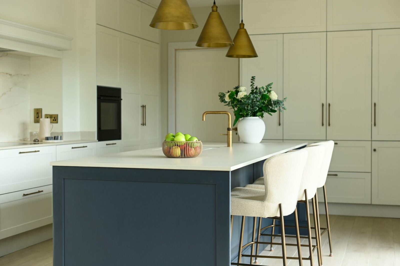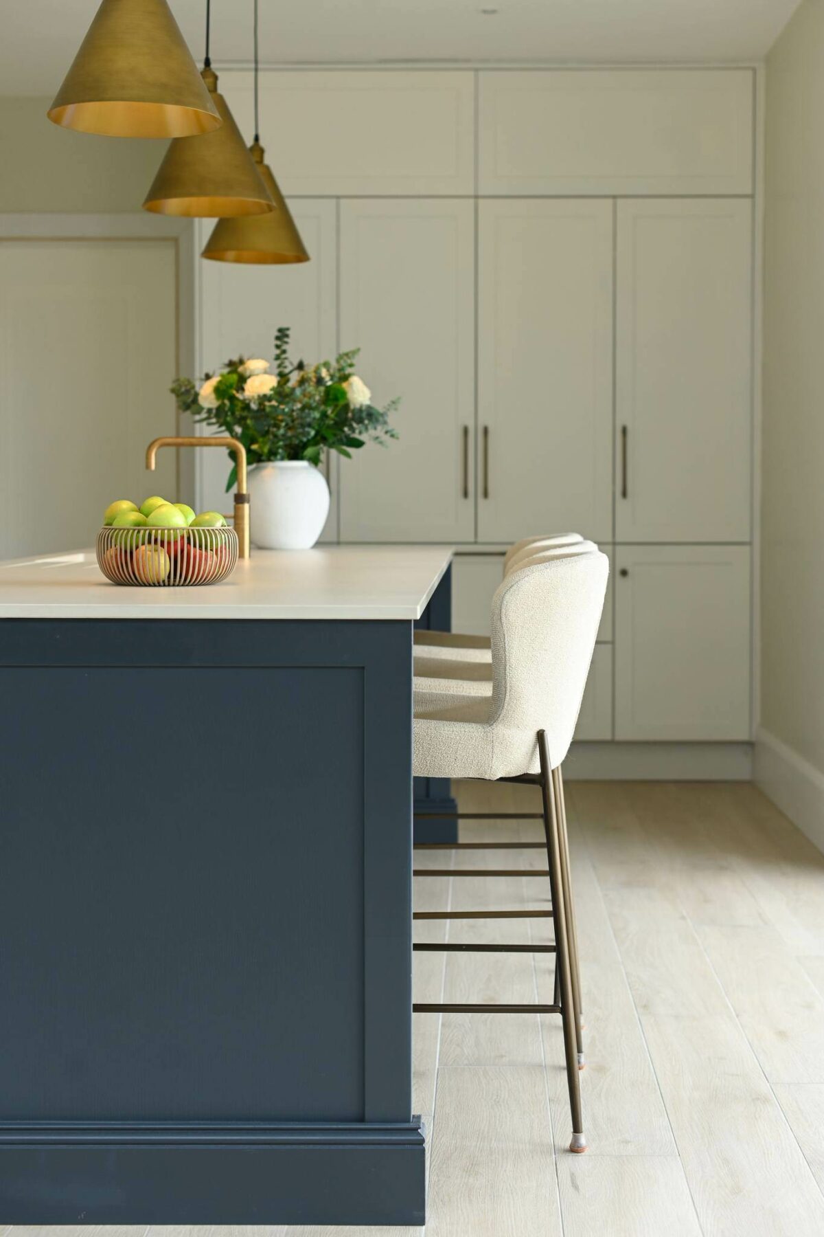 This transitional shaker kitchen blends timeless design with modern family living. The cabinetry is finished in Windborne White with a contrasting island in Railings paired with Dekton Ares. A patinated brass Quooker tap, walk-in pantry, step-out plinth detail and Neptune island lights add refined functionality. While antique brass handles and Dunvara Glam Counter Stools complete the warm, classic look. Designed for a young modern family, the space feels elegant, practical and enduring.
