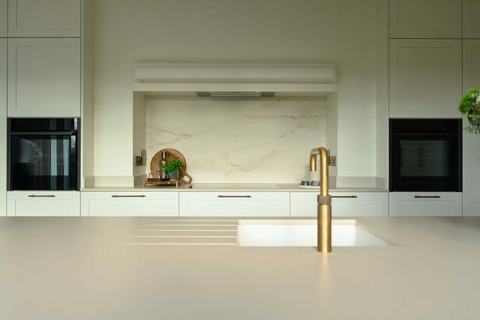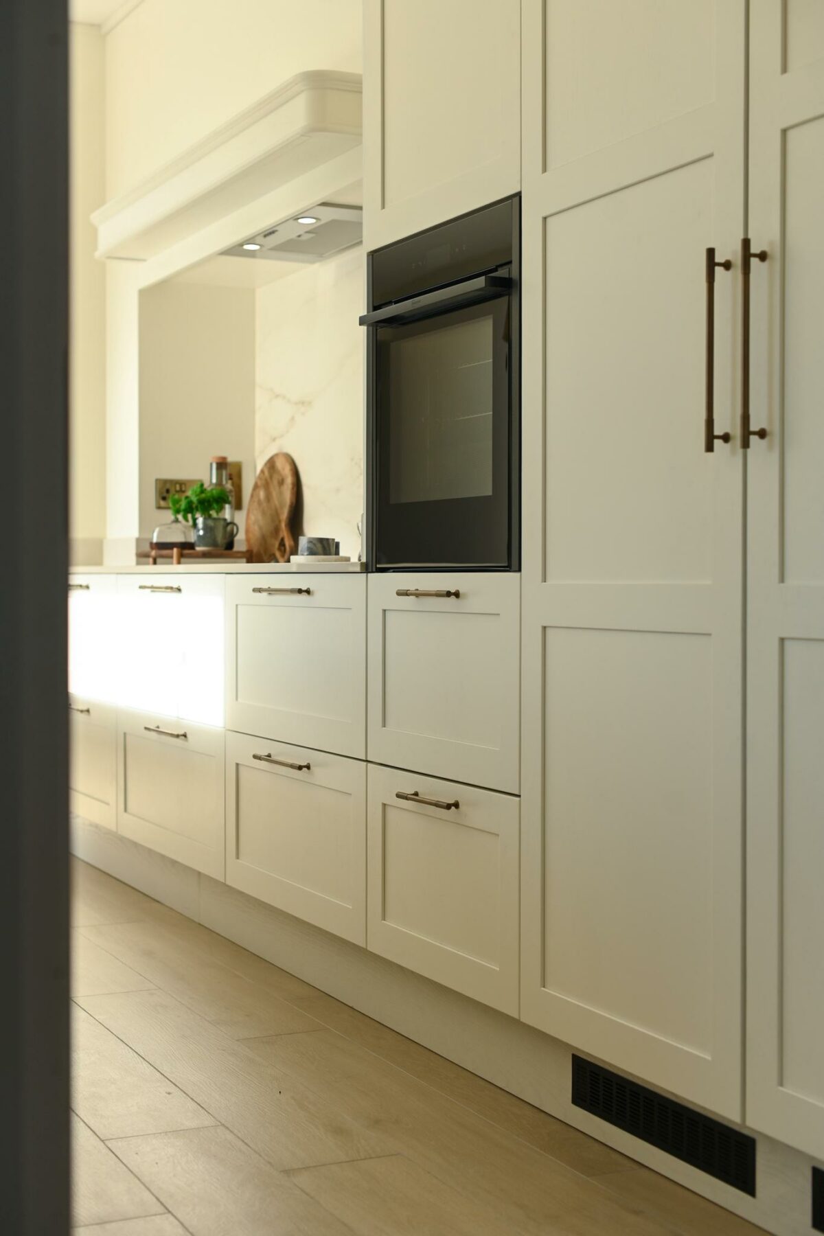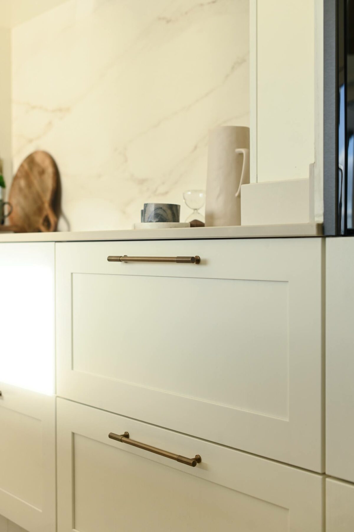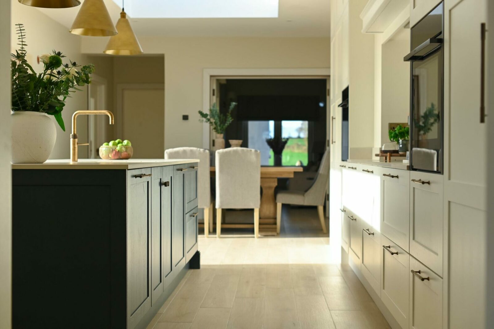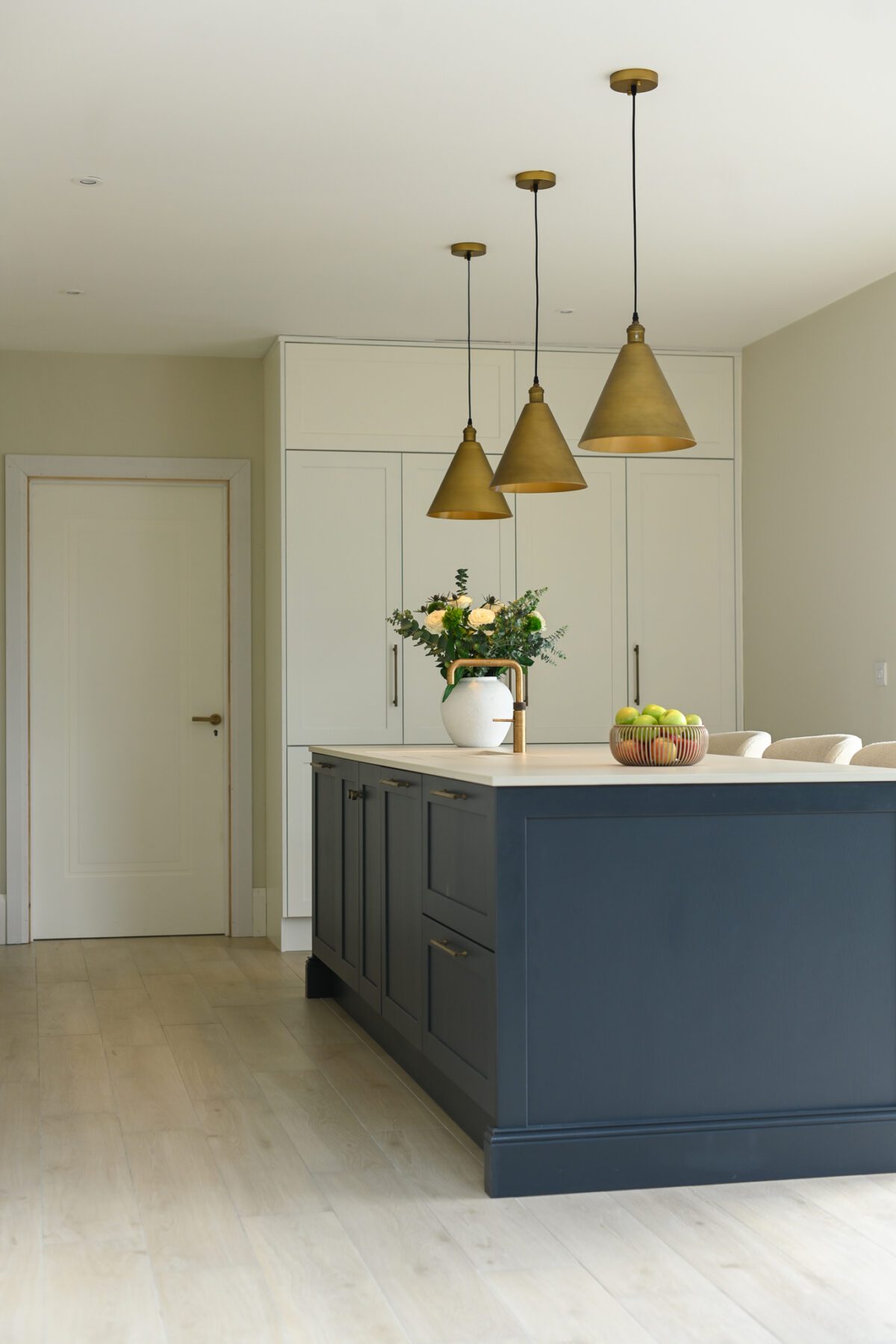This transitional shaker kitchen blends timeless design with modern family living. The cabinetry is finished in Windborne White with a contrasting island in Railings paired with Dekton Ares. A patinated brass Quooker tap, walk-in pantry, step-out plinth detail and Neptune island lights add refined functionality. While antique brass handles and Dunvara Glam Counter Stools complete the warm, classic look. Designed for a young modern family, the space feels elegant, practical and enduring.