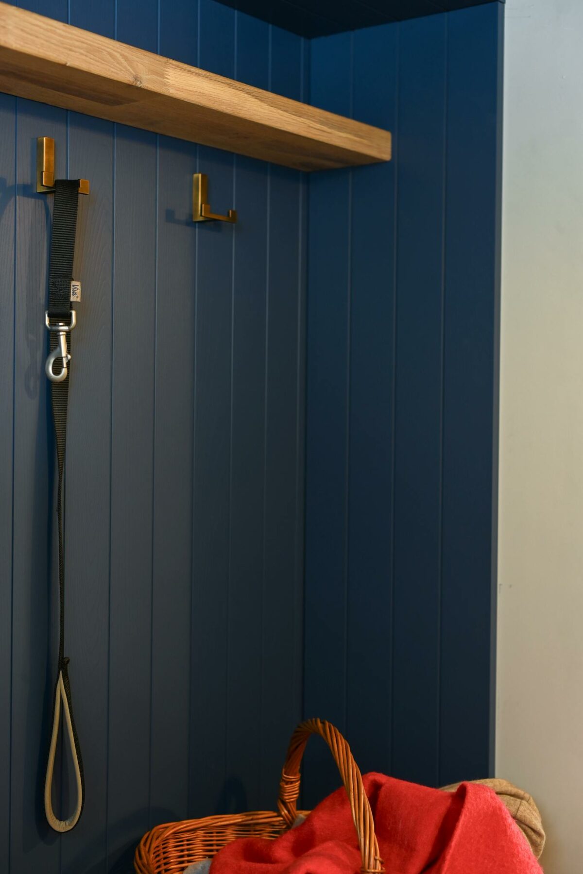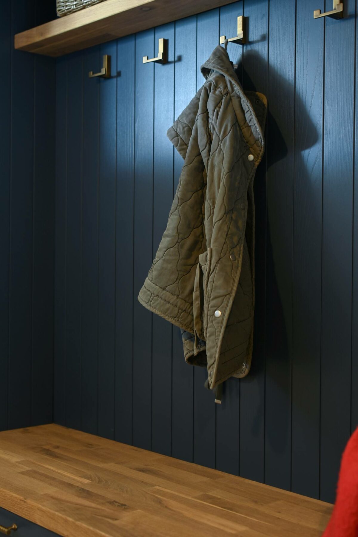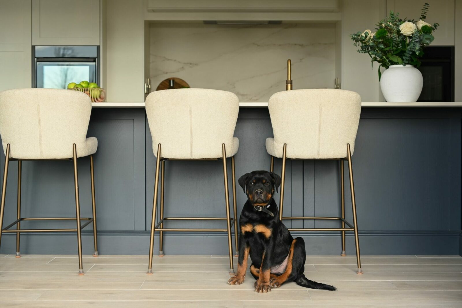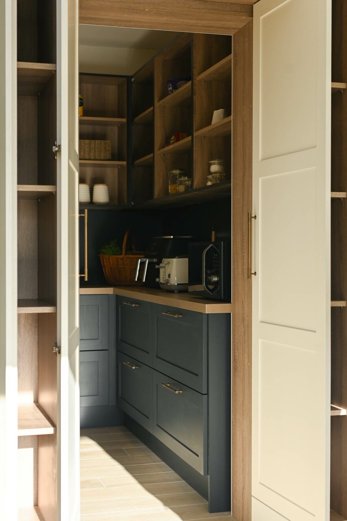 This transitional shaker kitchen blends timeless design with modern family living. The cabinetry is finished in Windborne White with a contrasting island in Railings paired with Dekton Ares. A patinated brass Quooker tap, walk-in pantry, step-out plinth detail and Neptune island lights add refined functionality. While antique brass handles and Dunvara Glam Counter Stools complete the warm, classic look. Designed for a young modern family, the space feels elegant, practical and enduring.