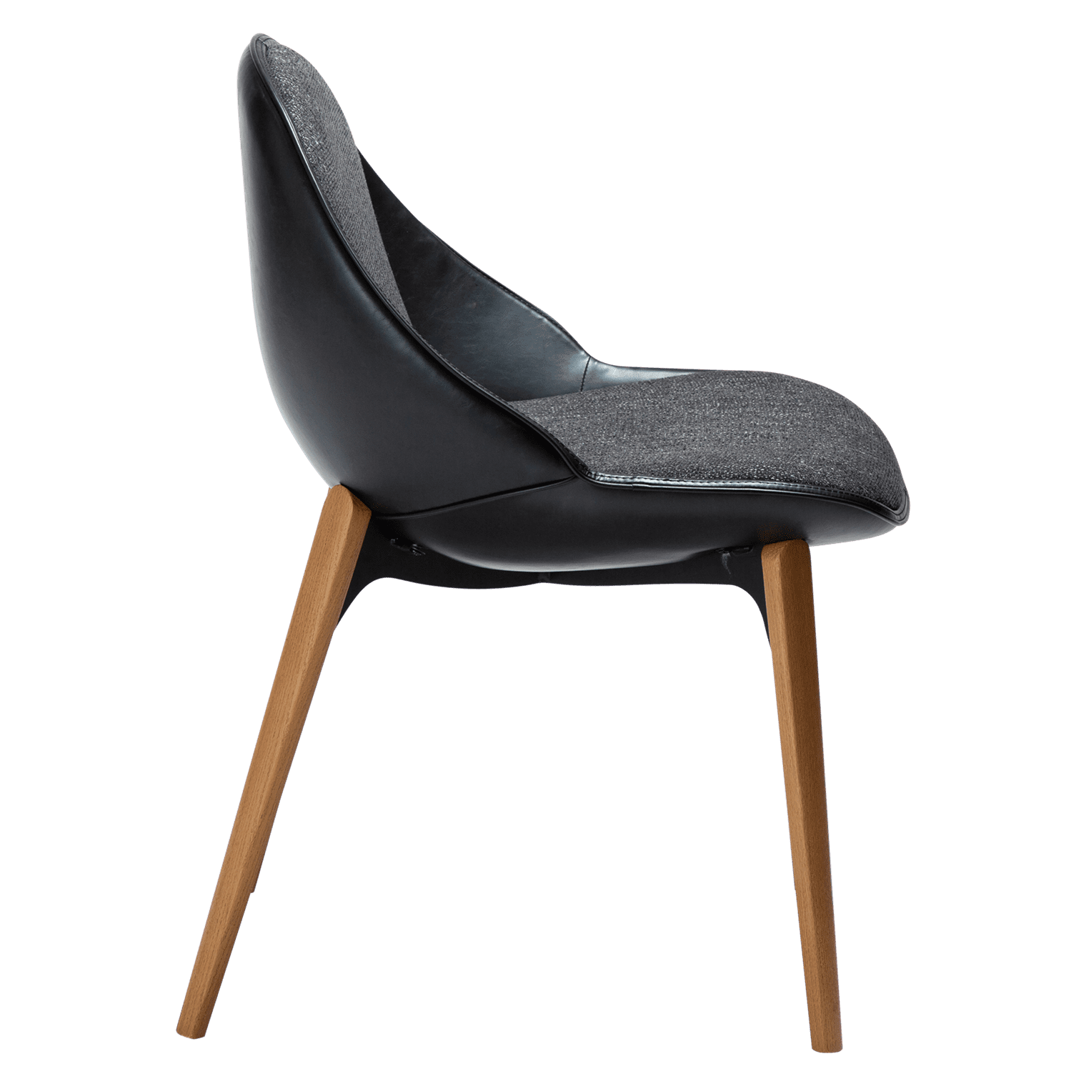 The ARCH chair stands on a sturdy metal frame, accented with stylish walnut wood legs. These legs extend slightly up the back, complementing the chair’s overall design and adding visual interest. The rich brown tones of the walnut provide a striking contrast to the lighter seat, making the chair a versatile fit for various interior styles.