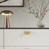 Its distinctive half-moon shape creates a soft, curved profile. At the same time, the smooth transition from flat to rounded adds subtle depth and detail. The handle sits slightly off the cabinet surface, creating a refined shadow line that enhances the overall look.
