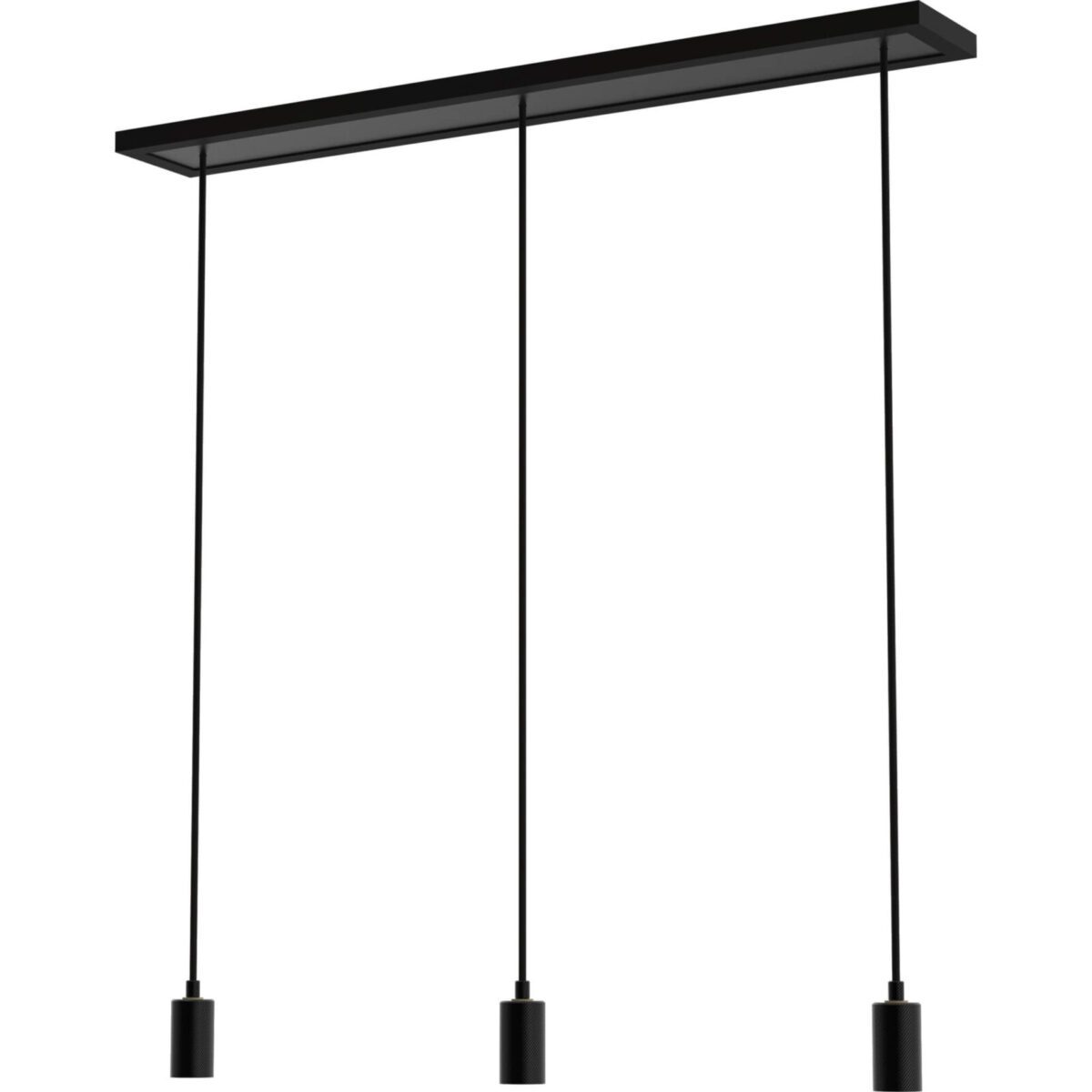 This elegant lamp consists of a faux leather-covered metal plate and has 3 pendants, each with a 1.5 m black fabric cable and an E27 plastic socket.