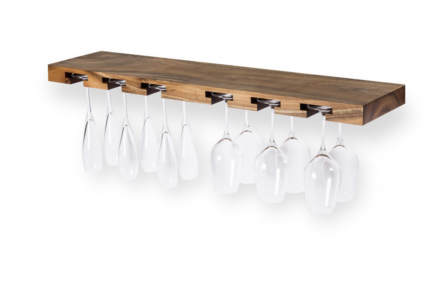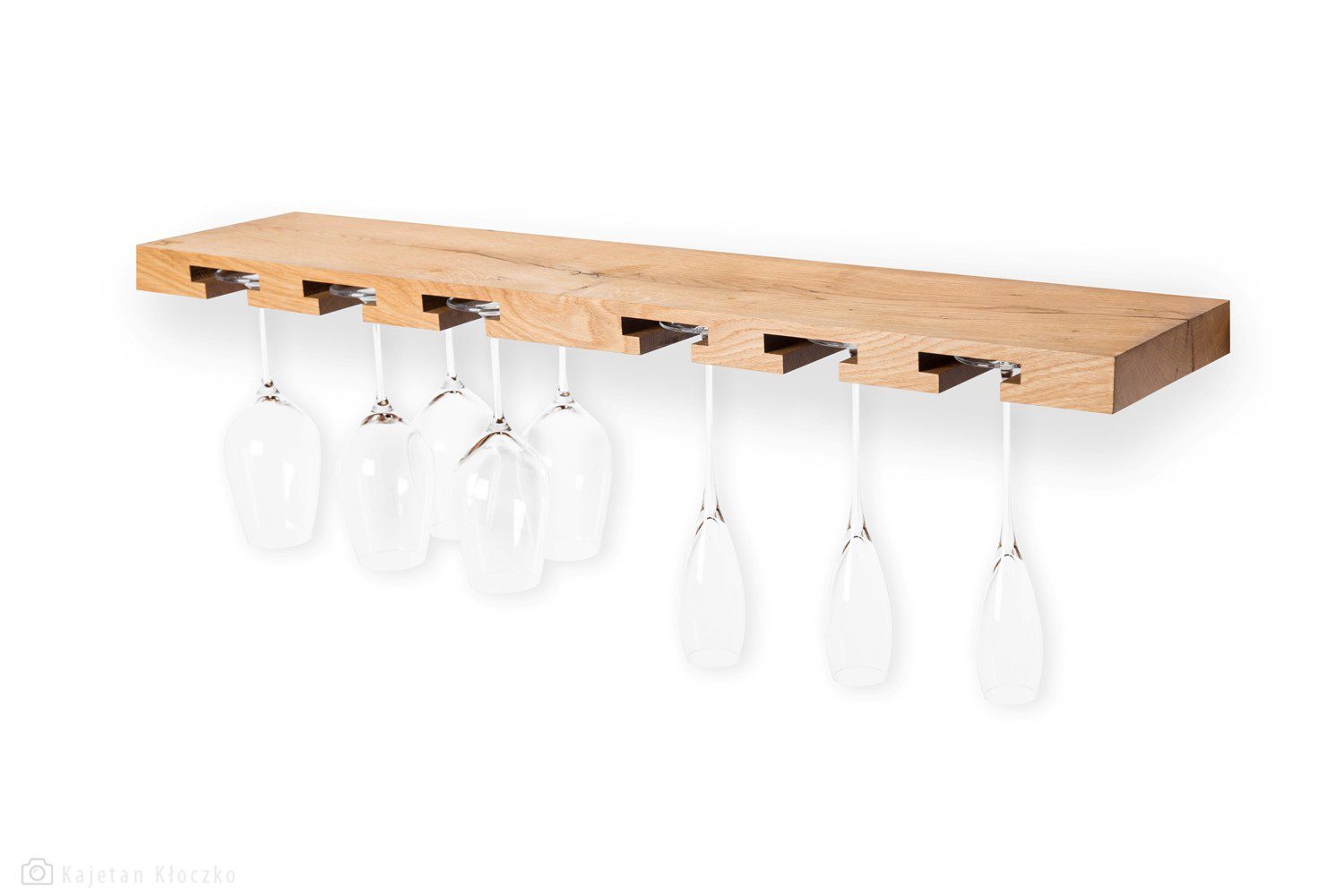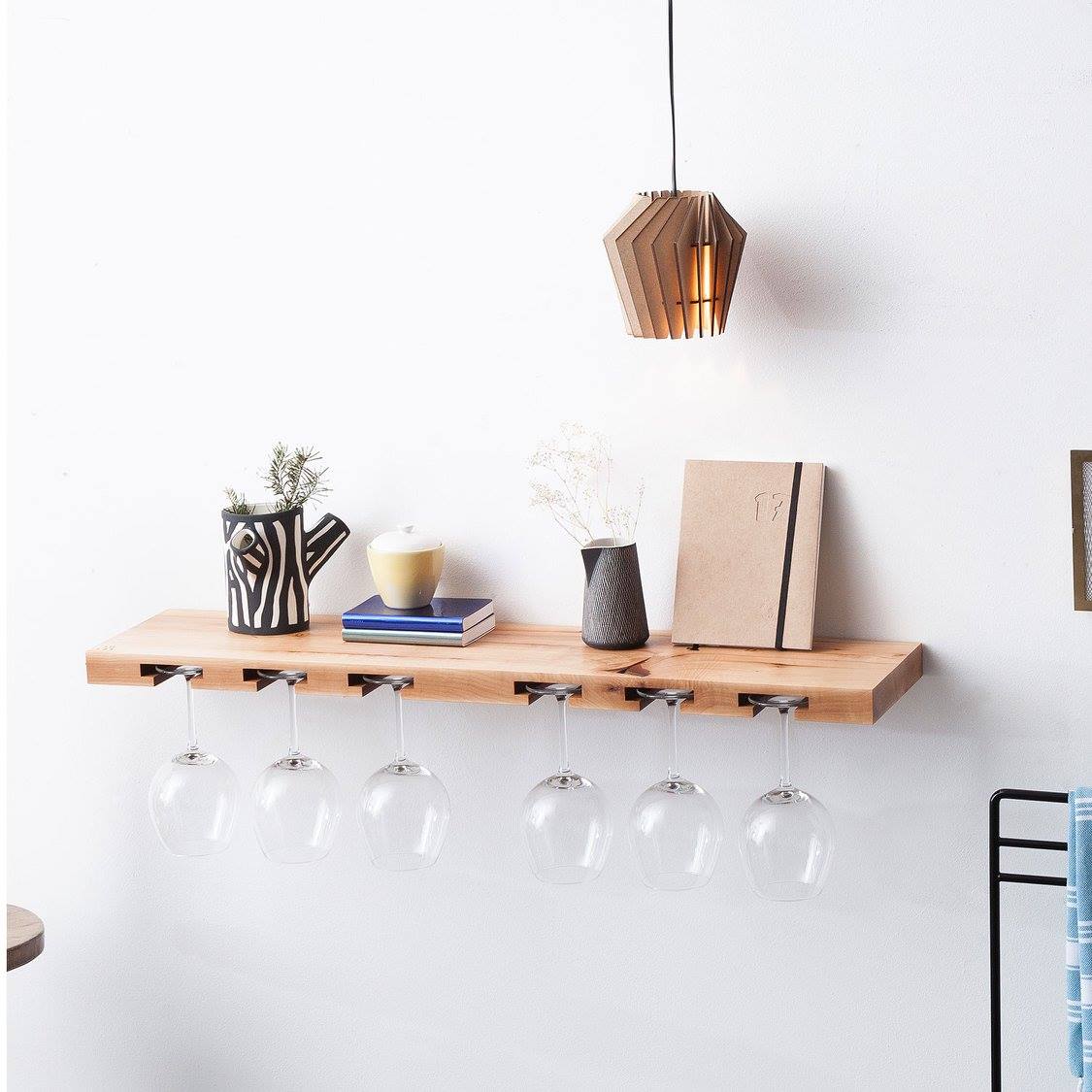 This handcrafted wooden wine glass shelf holds twelve wine glasses and features a floating shelf design with invisible mounting. Finished with a natural beeswax coating, it highlights the unique grain of the wood.